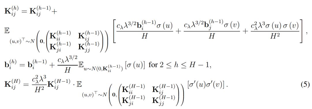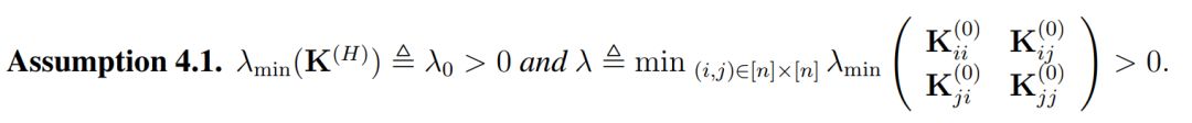 直观上而言,K^(h) 表示了在经过复合 h 次核函数后所得到的格莱姆矩阵(Gram matrix),其中核函数都是由激活函数σ所定义。此外,当权重矩阵的长和宽 m 趋向于无穷大时,它们会渐进格莱姆矩阵。因此作者做了以下假设以决定收敛率和过参数化总量: