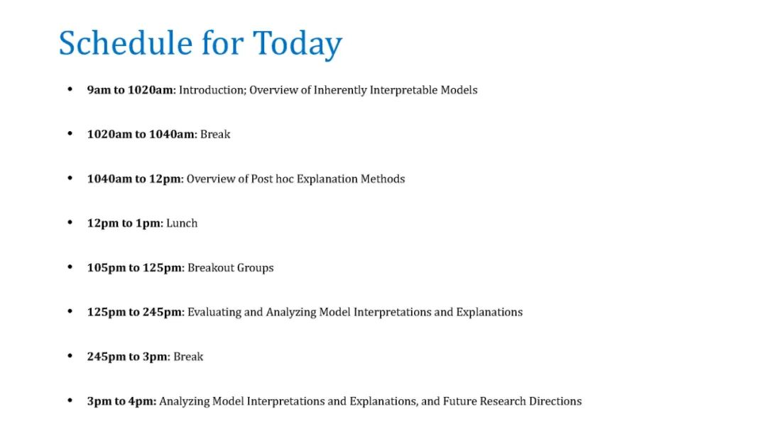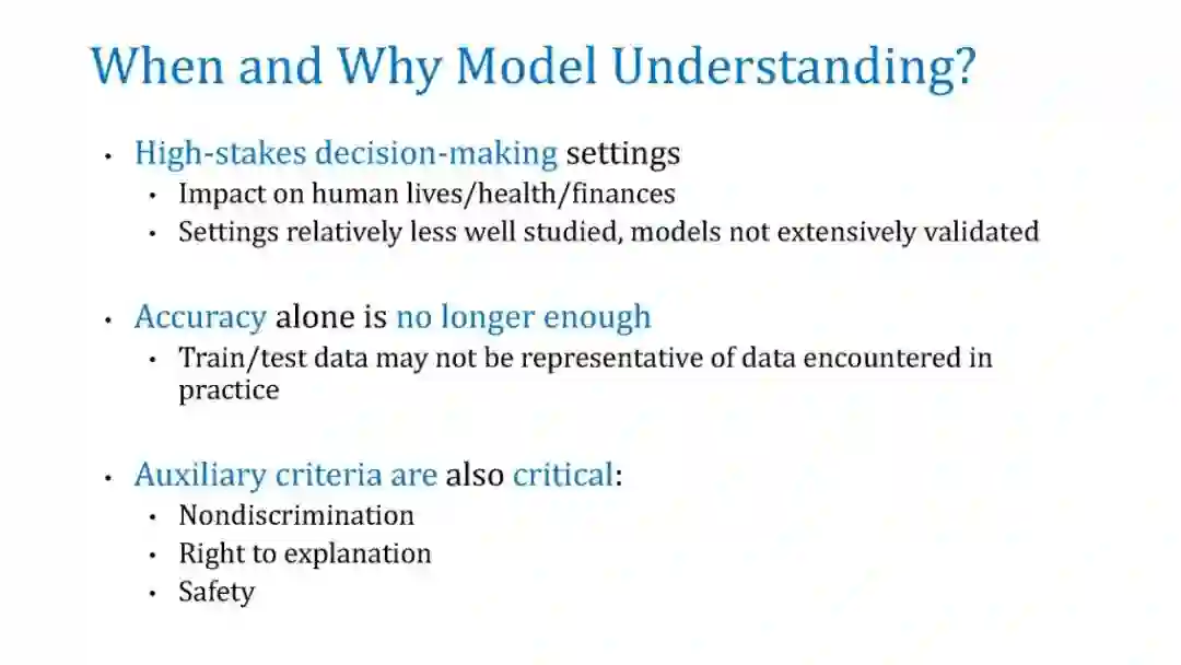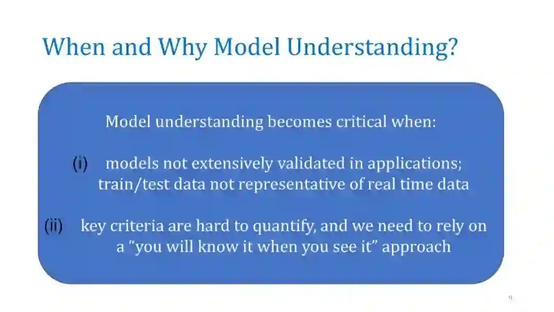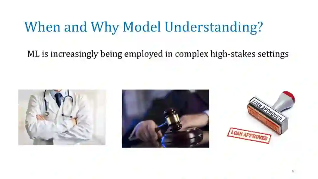 在本教程中,我们将讨论几种事后解释方法,并重点讨论它们的优缺点。我们将涵盖三大类技术:(a)单实例基于梯度的归因方法(显著图),(b)通过扰动的模型不可知论解释,如LIME和SHAP,以及(c)全局可解释性的代理建模,如MUSE。对于每一种方法,我们将提供它们的问题设置、突出的方法、示例应用程序,最后讨论它们的漏洞和缺点。我们希望为机器学习中的可解释性提供一个实用而深刻的介绍。