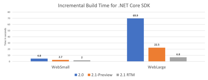 下图是.NET Core新老版构建时长的对比。可以看到较大的项目,其构建时长能节省一倍多,估计正式版本还会进一步优化。