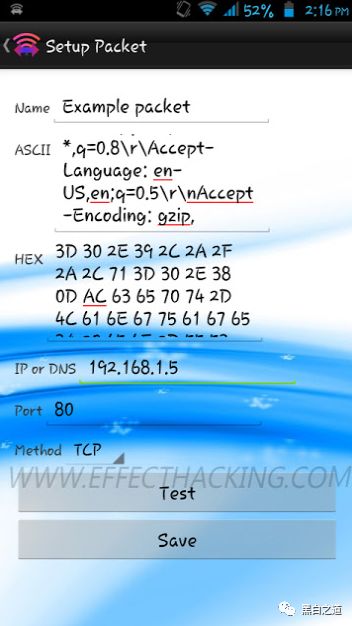 3.点击“测试”按钮。数据包发送方将数据包发送到目标IP。
