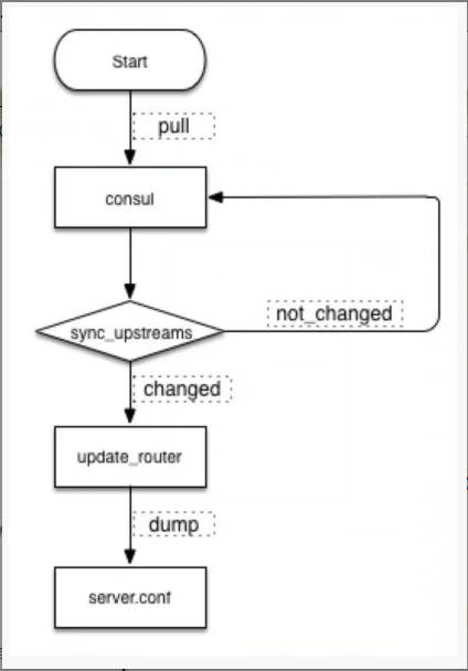 Upsync,开发了模块 nginx-upsync-module,它的功能是拉取 consul 的后端 server 的列表,并更新 Nginx 的路由信息。此模块不依赖于任何第三方模块。consul 作为 Nginx 的 db,利用 consul 的 KV 服务,每个 Nginx work 进程独立的去拉取各个 upstream 的配置,并更新各自的路由。
