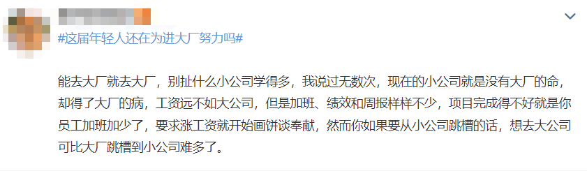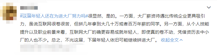 恰巧前段时间,#这届年轻人还在为进大厂努力吗?#话题冲上热搜,本以为处于舆论风口浪尖的大厂会让很多人望而却步。而事实却与之相反,通过身边朋友以及社交平台网友发言来看,哪怕风波不断,大厂也依然是大多数年轻人的第一选择。