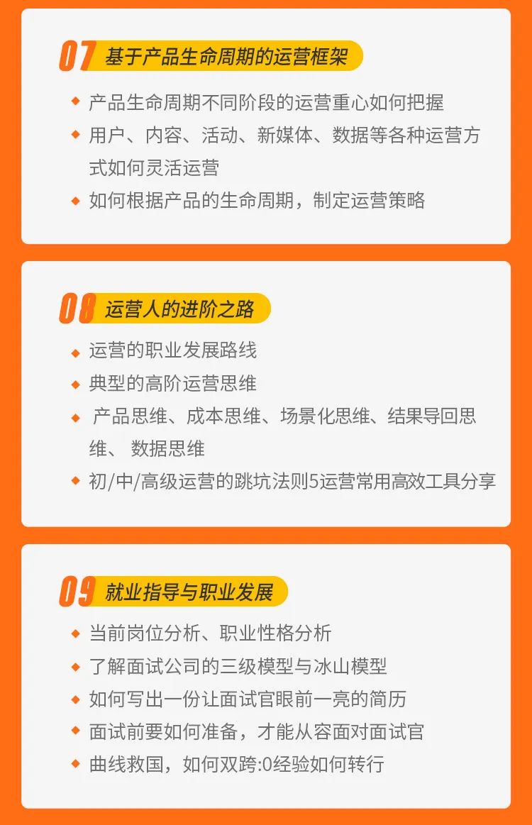 课程有八个运营知识板块,涉及市面上核心运营岗必备的知识技能,可以让你对各个运营岗位都有一套系统的工作方法,减少能力短板,从0-1搭建大厂运营人能力模型。