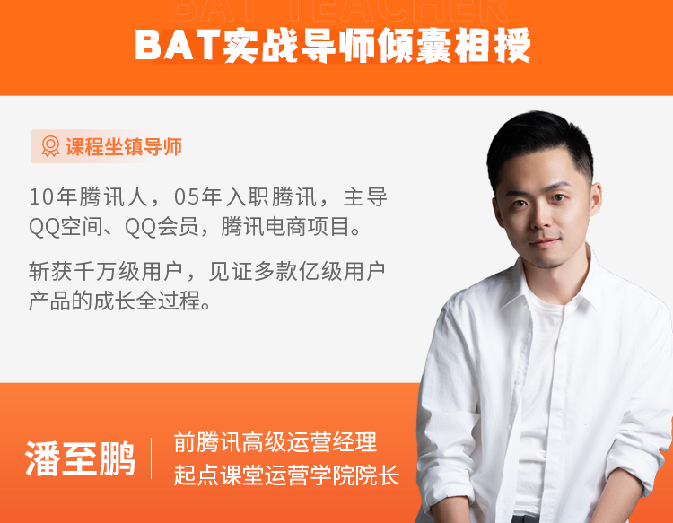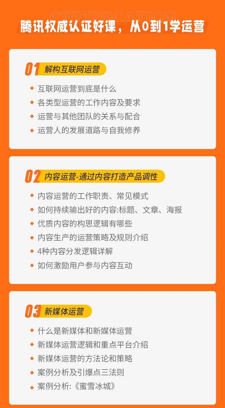 课程是腾讯官方认证的运营好课,内容经过腾讯P12级专家团队严格审核,对标腾讯P6-P8级别运营人能力标准。