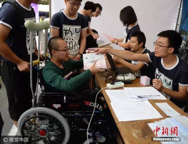 魏祥在辅导员和志愿者的陪伴下,来到清华综合体育馆完成了报到手续。北京青年报 郝羿 摄 图片来源:视觉中国
