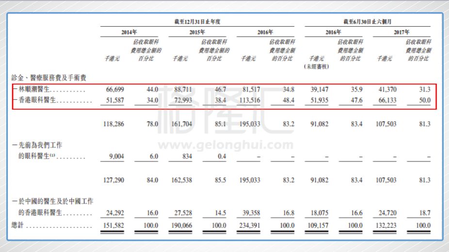 更重要的一点是,林医生就是希玛眼科的好招牌。前面我们说了,希玛的团队包括林医生共有9名香港执业眼科医生,以及29名中国医生,其中3名中国医生为居于中国的海外眼科医生。团队不算小,但林医生一个人在过去三年为公司贡献了44%、46.7%、34.8%的收益,2014和2015年林医生一个人超过其他8名香港医生贡献的收益。