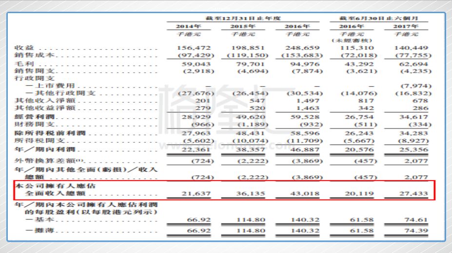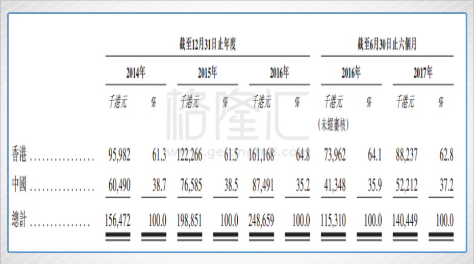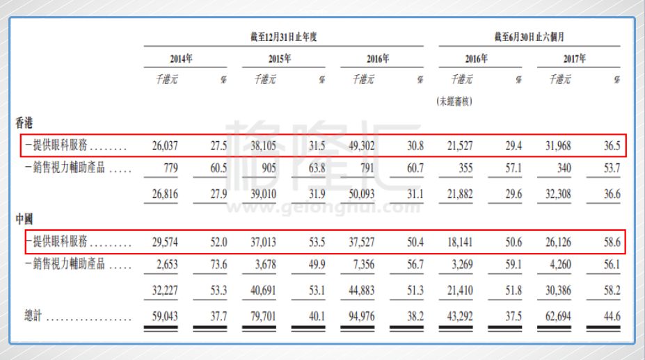 公司2014、2015、2016三个财年共录得总收益1.56亿港元、1.99亿港元、2.49亿港元,香港作为主营地区贡献了61.3%、61.5%、64.8%,深圳的希玛眼科医院贡献了38.7%、38.5%、35.2%;毛利率在37.7%、40.1%、38.2%,而今年上半年毛利率已经提高到了44.6%。