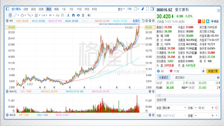 做医院的,市场普遍都给了较高的估值,比如“神经病第一股”康宁医院也有接近40倍的估值,而眼科这个专科,相较于其他专科服务,对医生的要求和依赖都更加高,对标国内的眼科专科龙头,爱尔眼科(300015.HK)目前的估值在65倍,16年最高估值达到84.5倍,强势的股价走势告诉你这个市场的空间有多大…