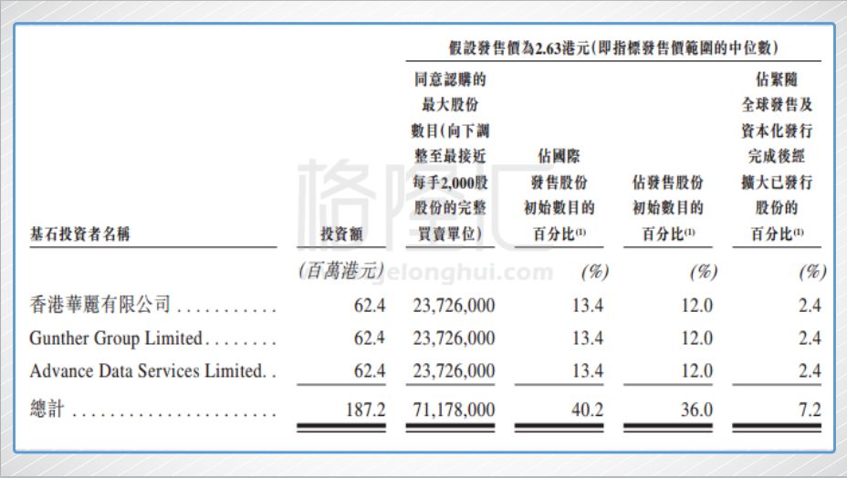 三位分别通过香港华丽有限公司(赵勇)、Gunther Group Limited(邢李㷧)、Advance Data Services Limited(马化腾)认购希玛的国际发售股份。按低位数发行价2.35港元、中位数2.63港元、高位数2.90港元来计算,各基石投资者认购国际发售股份2655.2万股(占发售股份的13.5%)、2372.6万股(占发售股份的12%)、2151.6万股(占发售股份的10.9%),各按发售价认购总额为6240万港元的国际发售股份,总共约1.87亿港元。(下图为中位数2.63港元的各基石投资者的持股比例)