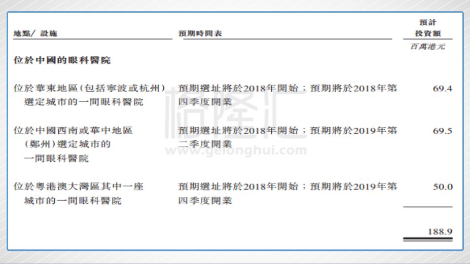 (2)40.4%的净额(约1.89亿港元)用于在国内开设三间眼科医院。公司计划分别在华东(宁波或杭州)、西南或华中地区(郑州)、粤港澳大湾区设立眼科医院;