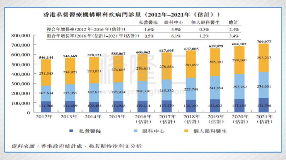 每年香港医疗市场的医疗支出都在稳步上升中,2016年的医疗支出已经达到1044亿港元,2012~2016年的复合年增长达到7.5%,预计到2021年医疗支持总额会达到1782亿港元。其中香港私营眼科服务市场的规模从2012年的27.95亿港元增加到2016年的34.55亿港元,复合年增长率为5.4%。由于老龄化不断增加,2015年统计的香港的65岁以上的人口已经达到112万(总人口的15.3%),白内障、视网膜脱落及青光眼这样老年人常见眼科疾病也会不断增加,所以预计到2021年私营眼科的市场规模将达到48.44亿港元。