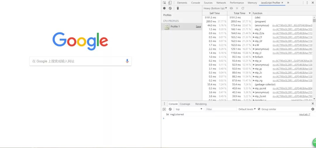 我们可以清除看见 JS 执行时各函数的执行时间以及 CPU 占用情况,如果我在代码里增加一行 while(true){}, 那么它的占用率一定会飙升到一个异常的指标(亲测 93.26%)。