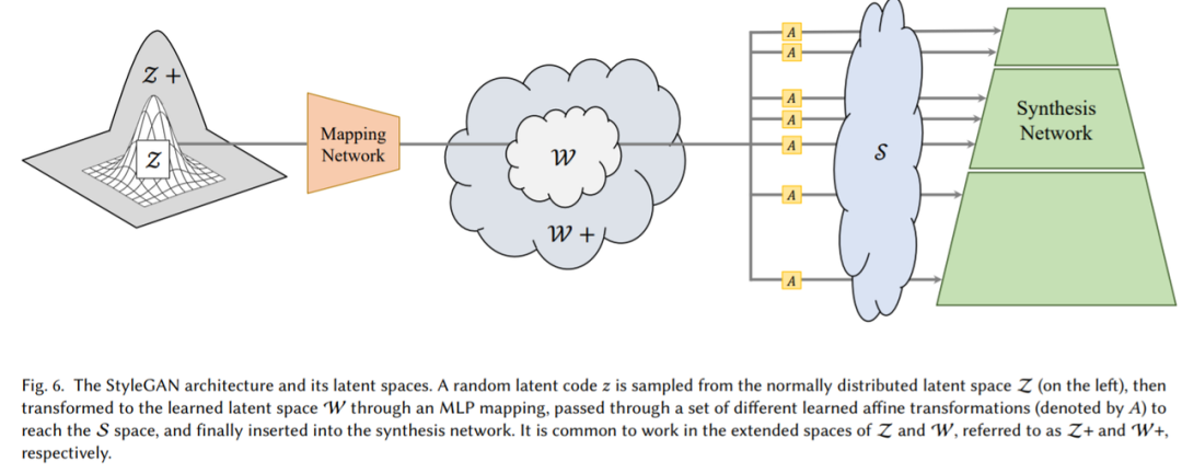 与普通的 GAN 不同,StyleGAN 有不止一个固有的潜在空间。此外,为了增加 StyleGAN 的表现力,通常会使用这些空间的扩展,如图 6。