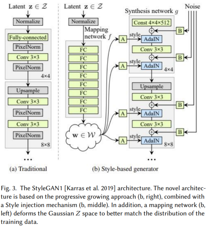StyleGAN1。基于风格的生成器架构,或简称 StyleGAN,最初由 Karras 等人在 2019 年提出。StyleGAN 架构的核心是风格调制层(style modulation layers),StyleGAN 的名字就是从这里得来的, 其能够生成高质量的图像数据并且做到了高层特征可控。