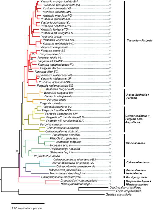 基于 RAD 数据构建的温带木本竹子系统发育树。分支上的数字代表靴代值,高于95%的靴代值未显示。粗的枝代表粗型地下茎类型,细的枝代表细型地下茎类型。