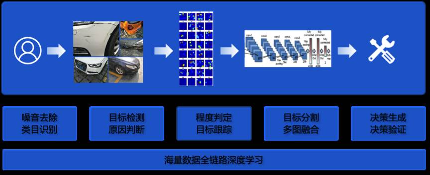 从用户体验上看以往传统保险公司的车险处理流程,一般为报案、现场查勘、提交理赔材料、审核、最终赔付。用户完成整套链路获得理赔的周期往往长达几周甚至一个月。蚂蚁“定损宝”的终极目标不仅仅是服务于保险公司,更要在未来通过深度学习技术解决用户长期的痛点,使得用户在车险理赔过程中可以在现场拍照上传图片,在几秒内就能得到准确的定损结论,并快速获得理赔。