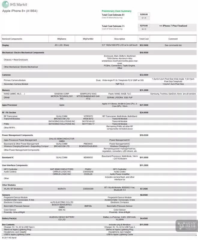 所以根据 IHS Markit 的成本表推算后我们不难发现,这款 iPhone 的物料成本会比 iPhone X 二代低100美元左右,比 iPhone 8 贵不了多少,贵在屏幕和前置 TureDepth 摄像头,便宜在 Force Touch 。作为参考, iPhone X 的毛利率高达63%。