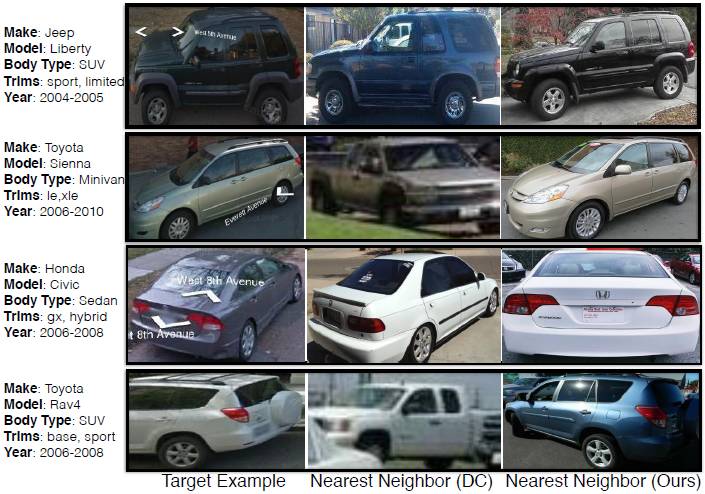 在本论文中,我们研究了如何突破有标签图片的数据集,让真实世界的图像能被计算机精细地识别出来。由于图片标注的广泛使用,用于提升识别表现的适应性并没有被研究者们深入研究。我们基于属性的所任务适应性损失函数在半监督适应条件下可将准确率从基准的 4.1% 提升到 19.1%。此前,域适应工作已在小数据集(如 795 个各种领域的数据集),和一些简单的数据集(如数字组成的数据集)上展示了自己的能力。而在本研究中,我们使用了极具挑战性的细粒度数据子集,其中包含来自商业网站和谷歌街景的约 110 万张张图片,其中包含 2657 种汽车车型。