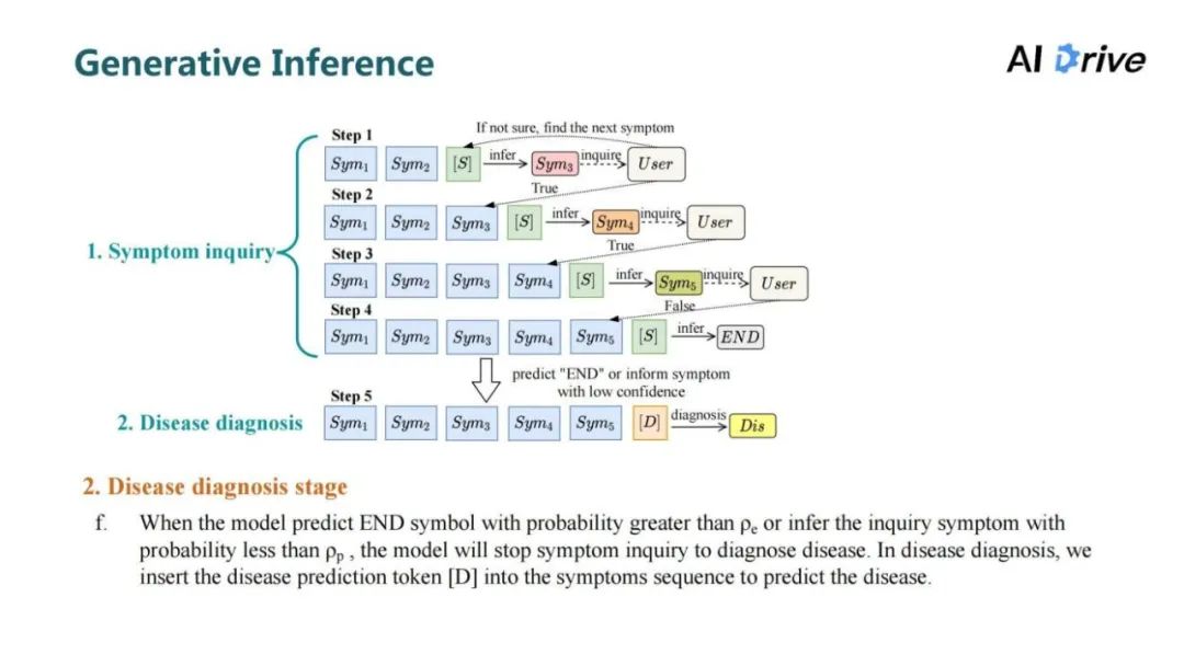 当由症状符号推理出结束信号,或者当预测症状概率的自信度低于阈值时,模型会停止症状询问从而进行疾病诊断,拼接疾病预测符号预测出目标疾病。