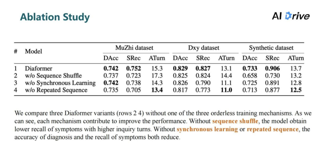 对三个的无序训练机制设定了一个消融实验,结果表明在缺少任何一种无序训练机制的情况下,症状的召回率还有疾病预测的准确率都会出现不同程度的下降,尤其是在比规模较大的合成数据集上,其性能下滑最为明显。
