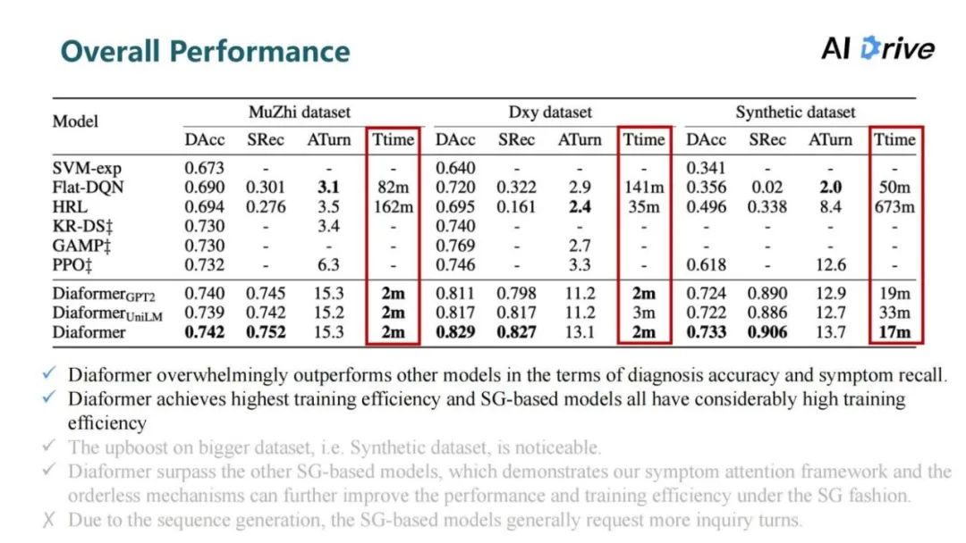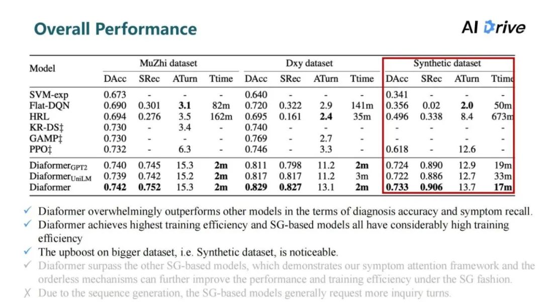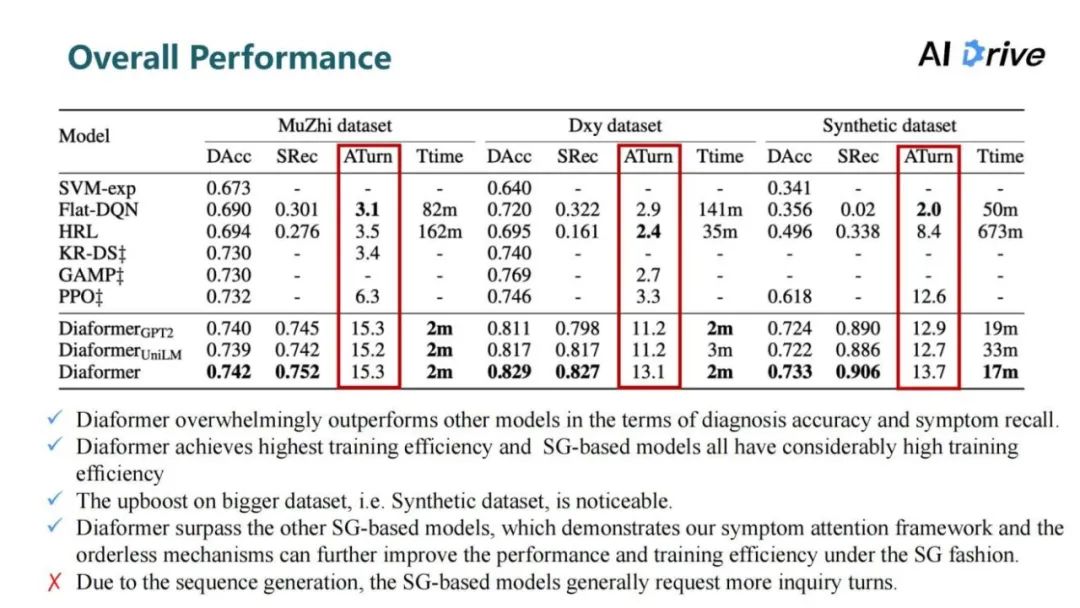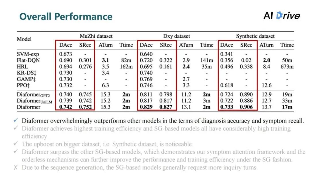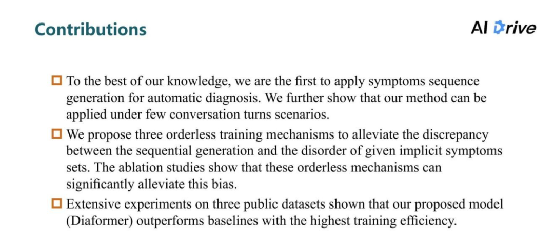 上图是本论文的一个贡献点,该论文是首次采用虚症状序列生成的模型做自动诊断的方法,因为之前大部分模型大多采用强化学习的方法,还有一些基于 SVM、基于逻辑回归、基于随机森林的方法,进一步展示了模型,可以在有限的论述中,能比其它基线模型要好。
