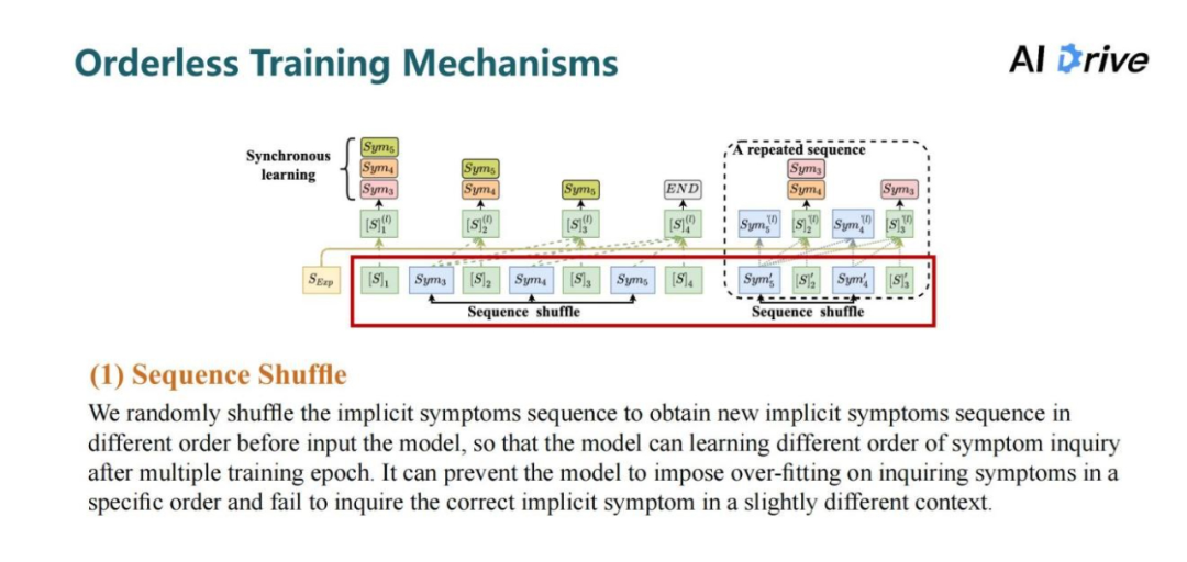 第一个机制是序列打乱。在每次输入模型训练的序列时,会对隐性症状序列进行重新打乱,防止模型过度依赖于特定顺序的症状序列预测。