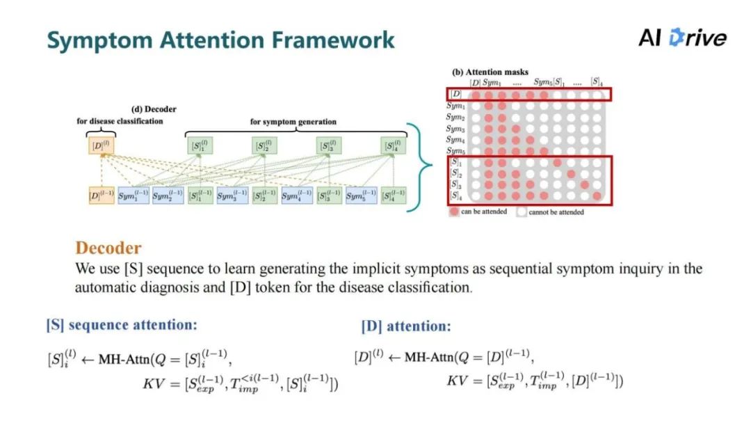 对于解码器,使用了两个人工符号,一个是症状预测的符号,另一个是疾病预测的符号。在训练过程中,利用症状预测符号序列来实现隐性症状序列的自回归生成,可视为一次学习多个阶段的症状推理;疾病预测符号则基于所有症状信息学习生成目标疾病。