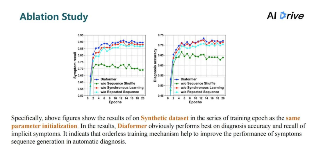 在合成数据集下,采用相同参数的初始化,对比每个的训练轮数下的结果比较。可以看出无论是症状的召回率或者是疾病预测的准确率上,使用了三个无序训练机制的模型,都能达到更高的学习效率以及取得更好的结果。