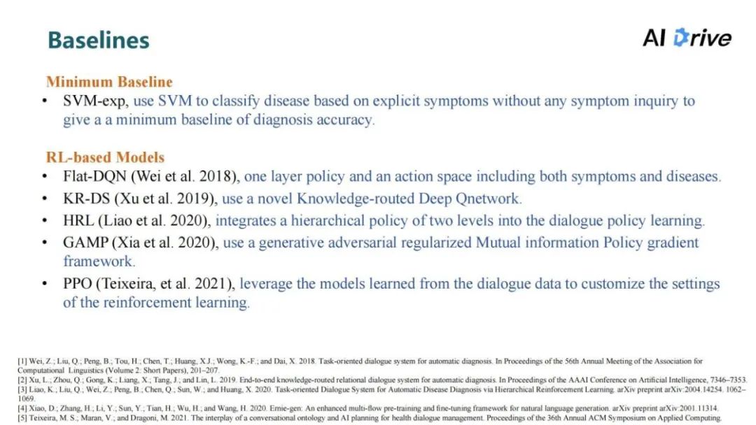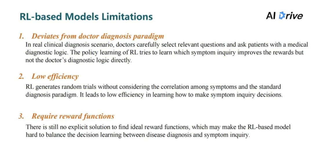 此外,目前还没有寻找理想的 Reward 函数的有效方法,导致基于强化学习的方法难以权衡疾病诊断和症状查询之间的决策选择。