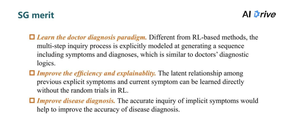 但是强化学习如何查询症状,并在最后的准确率的奖励下才会做出这种疾病诊断,这其中存在偏差,也在一定程度上偏离了医生的实际诊断流程。