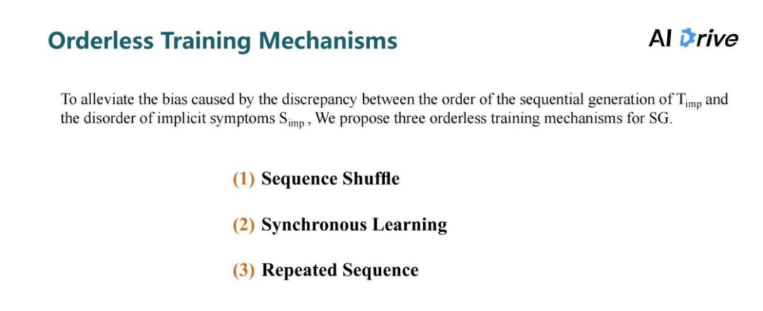 以上症状注意力框架是一个序列生成模型,它只能学习特定顺序的症状序列的生成,模型会在症状序列的次序下学习症状推理。但是在数据集或是在现实生活中,患者的隐性症状本身是没有次序关系,所以这导致了序列生成的有次序询问的学习逻辑与隐形症状推理的无序性的偏差。对此提出了三个无序的训练机制,让模型不依赖于特定的症状次序推理,从而学习显性症状到隐性症状以及隐性症状之间的推理。