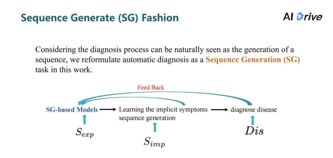 考虑到疾病诊断过程可以自然地被看作是一个序列的生成,在本工作中把自动诊断重新表述为序列生成的任务,与之前的强化学习方法不同,多步骤的查询过程被明确的建模为:生成包含症状和诊断的序列。这可以提高多步骤推理过程的效率和可解释性。