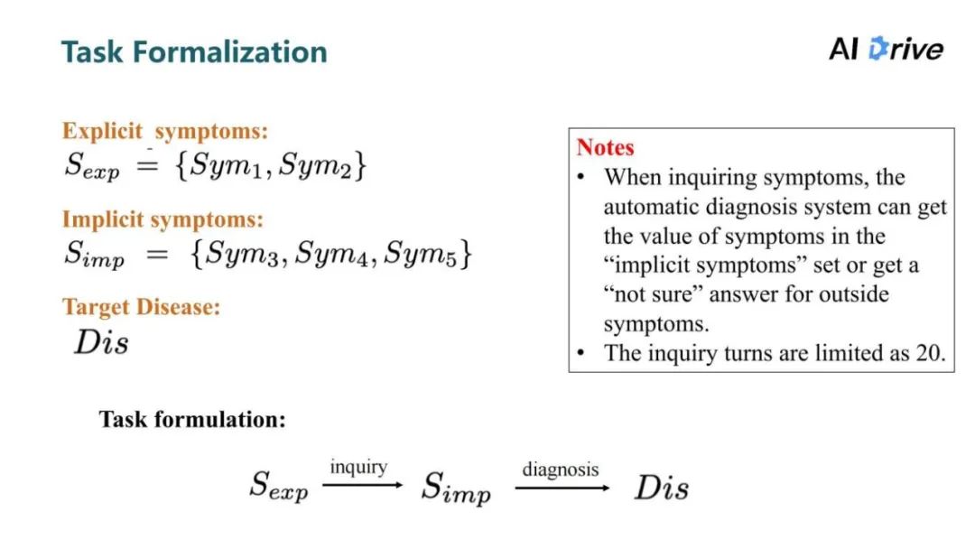 这里给定一个严格的定义,使机器和用户互动,在获得用户自我报告的基础上询问用户显性症状以外的其他症状,并且最后给出疾病诊断。当询问额外的症状时,自动诊断系统只能获得隐性症状集合中的症状值,对于其他外部症状(就是不相关的症状),用户回答 not sure 。因此,疾病诊断任务可以被定义为在有限的交互集合和交互回合中来逐步询问隐性症状,然后根据显性症状和所询问的附加症状来诊断疾病。