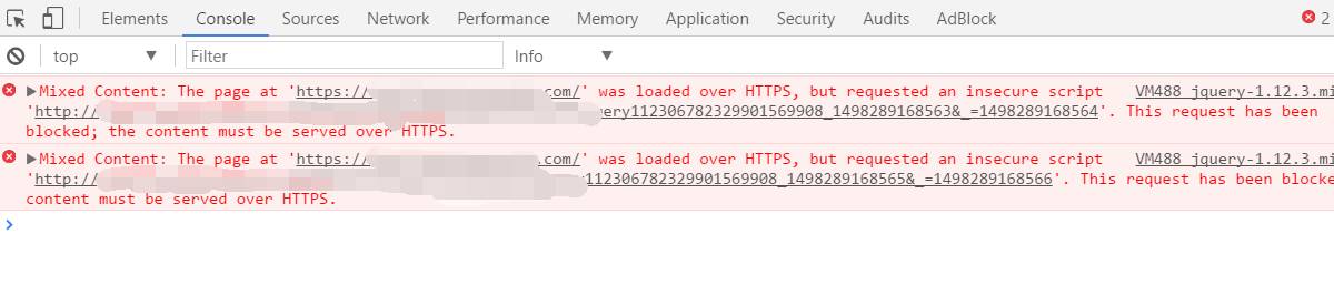 Mixed Content: The page at 'https://domain.com/' was loaded over HTTPS, but requested an insecure script 'http://domain.com/'. This request has been blocked; the content must be served over HTTPS.