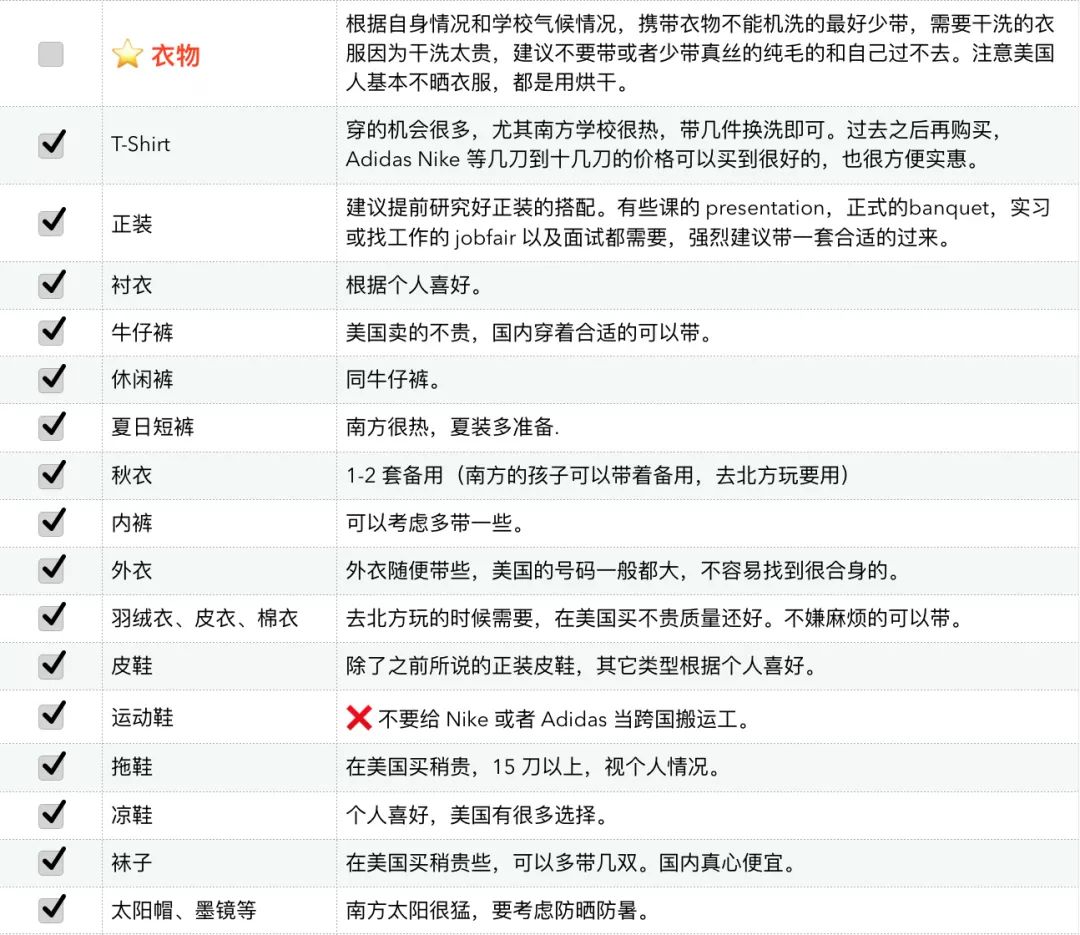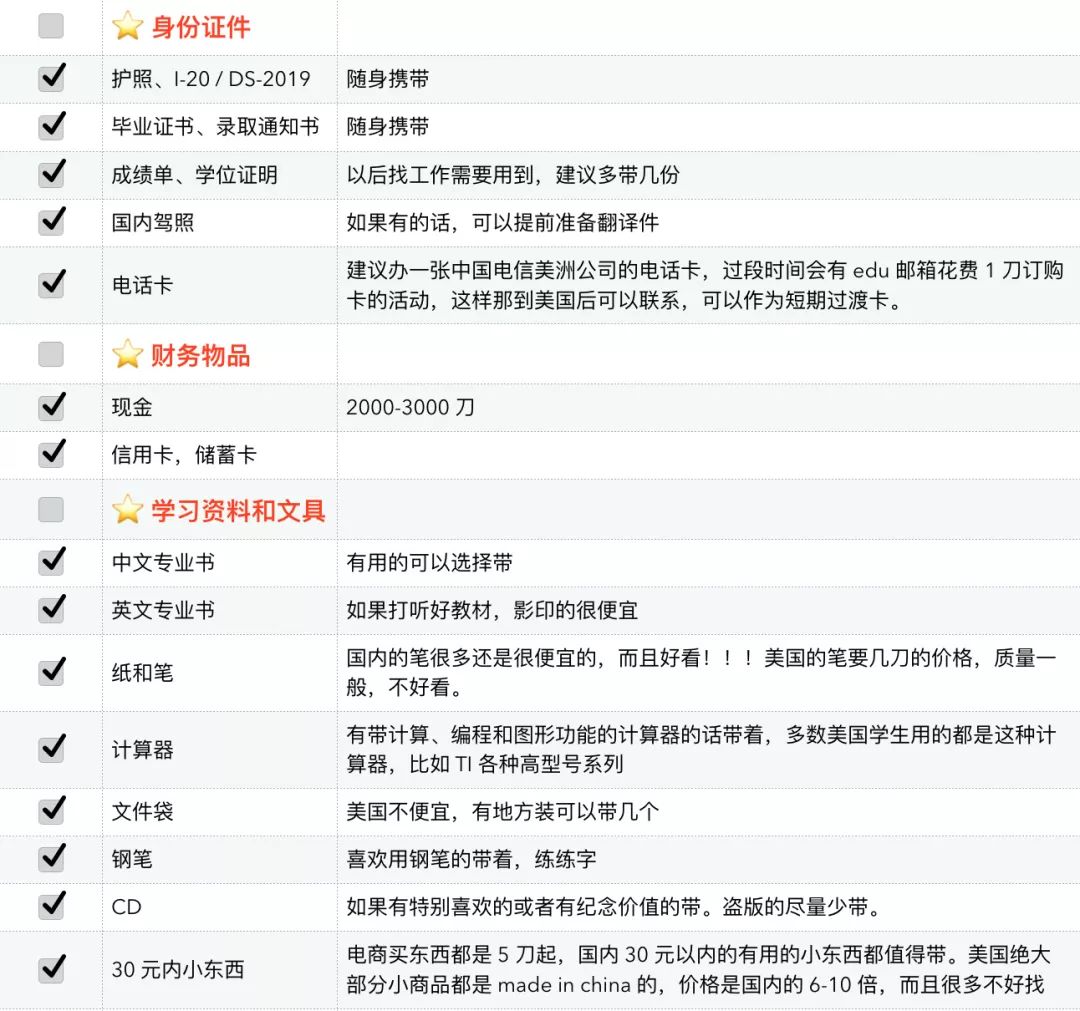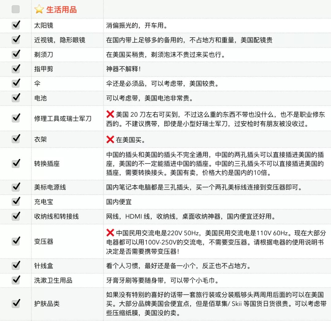 原则上说,只需要带上足够的银子,那么行前准备物品基本都可以选择不带,美国当地人也需要生活,生活必需品都能够买到。于是我们清楚了我们所要托运半个地球带的东西主要是为了省钱、方便和个人喜好。有了这个原则,就可以对以下的 list 有一个自己的判断,不要干费力不讨好的事情,行李超重了被罚了钱,之前为了节约的那一二十刀就直接交给了航空公司。习惯不同,每个人有不同的的行李准备的选择,这里只说一点:根据学校的地理,气候,学校要求来以及个人的喜好来选择相应的托运行李的内容。最后还是再强调一点,出门以前称好行李重量,不要到了机场托运时才被人告知超重,于是前功尽弃。
