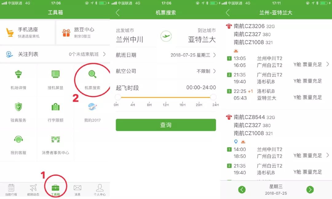 下面来介绍一下如何使用航旅纵横来搜索机票信息。 在主页面点击 工具箱,选择 机票搜索,输入出发城市和到达城市,如图搜索兰州中川机场到亚特兰大的航班,选择不限航空公司,搜索所有航班,可以看到列出来的搜索结果。