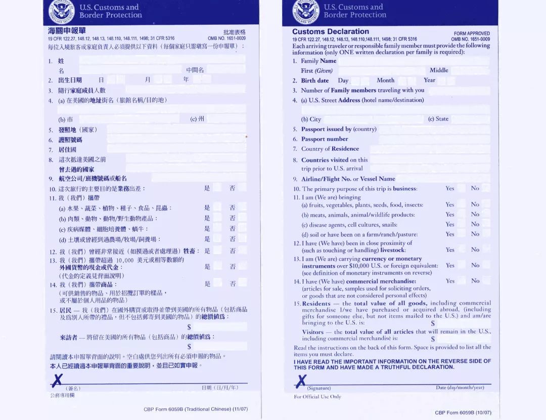 在飞机即将抵达美国时,空乘人员会发给大家一张蓝色的是报关单,一个家庭只用填一份,出关时会有工作人员收走。