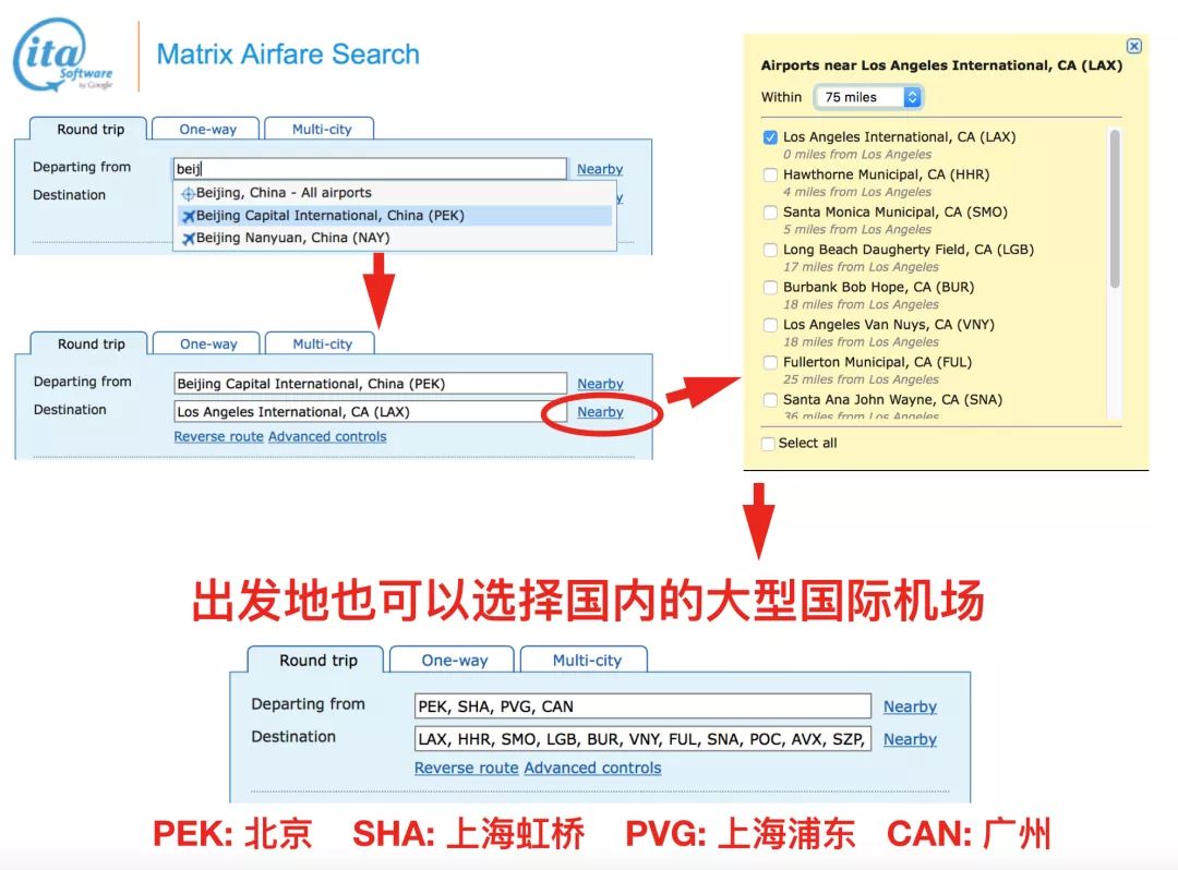 进入网站界面可以看到出发地和目的地,都是三位机场代码。可以根据名称模糊搜索提示所需的机场代码。在选择完地点后,点击 nearby 可以选择周围的机场,有范围搜索,如图中选择距离洛杉矶机场 75 miles 以内的机场。出发地如果想参考国内的几个大型机场的价格,也可以依次输入三位机场代码(在 国内主要航机场三字代码 - 民航资源网 可以查到),用 逗号+空格 隔开,这样就确定了航班的城市矩阵,这也是 Matrix 的名字由来。