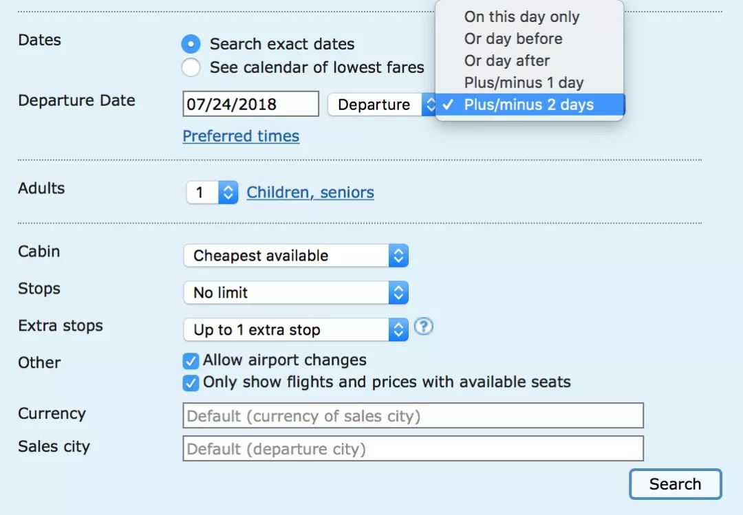 出发时间可以模糊搜索,最多在某一日期的前后各两天,5 天的时间内搜索。还可以选择偏好,如不想转机、最多一次转机、时间最快还是最省钱,然后就可以一键搜索了。通过几步设置可以瞬间搜索到大量的机票信息。