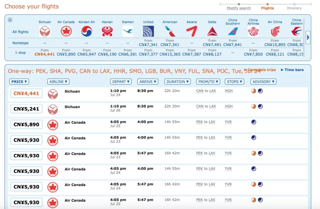 一般你们是怎么买机票的呢?想一想,打开携程、飞猪、去哪儿网搜索起点终点,出来一堆航班,比比价: