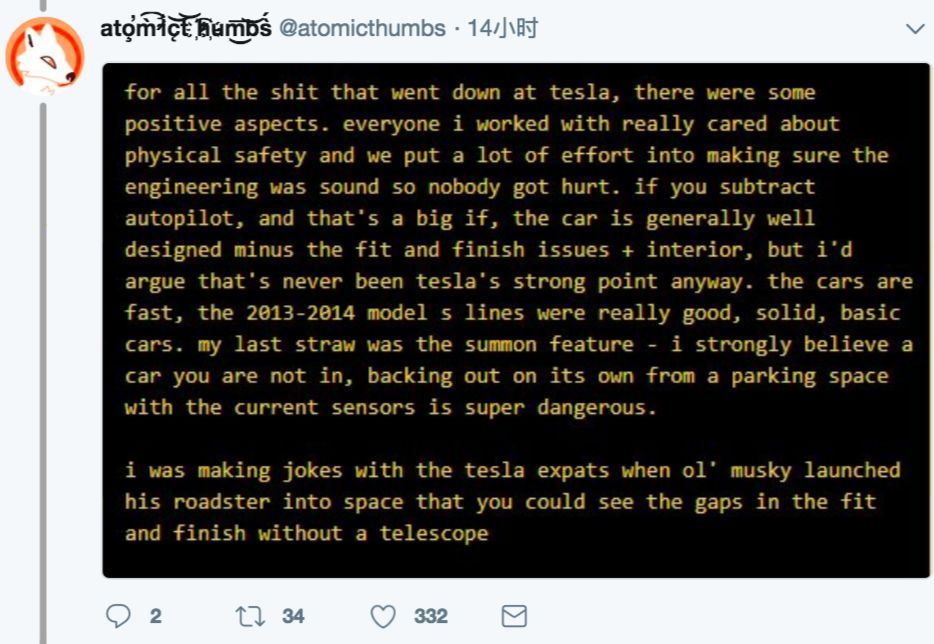 但同时,这名前员工也表示,他和所有的特斯拉员工一样,都将客户的安全放在第一位,是真的很关心用户的生命安全,也为此投入了很多心力。