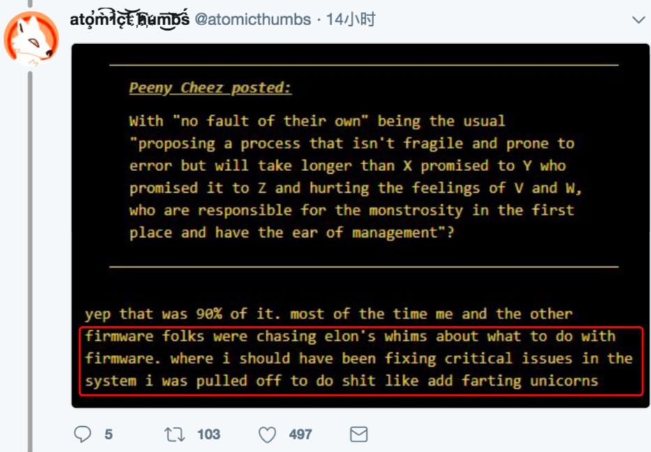 马斯克关于固件随时都有新的创想,所有的固件工程师都忙于满足这位CEO的天马行空、但可能只是锦上添花的要求,而没有时间去解决真正重要的系统疏漏。