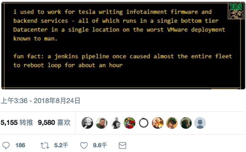 这名前特斯拉员工称,他以前在特斯拉写固件和后端代码,“所有东西都在单个数据中心同一个底层你能想到的最糟糕的VWare部署上运行”,“一个Jenkins pipeline的问题就曾导致整个车队重启了大概一小时”。