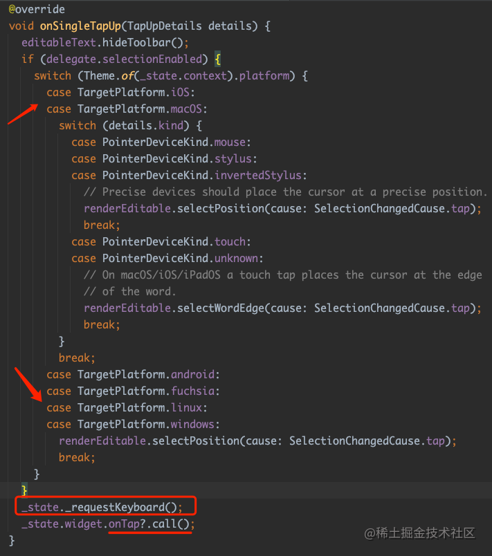例如在 _TextFieldSelectionGestureDetectorBuilder 中,可以看到 onSingleTapUp 的处理流程: