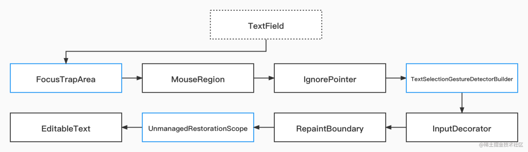 关于 TextSelectionGestureDetectorBuilder 大家应该比较少接触,而在 TextField 里使用的是它的子类 _TextFieldSelectionGestureDetectorBuilder: