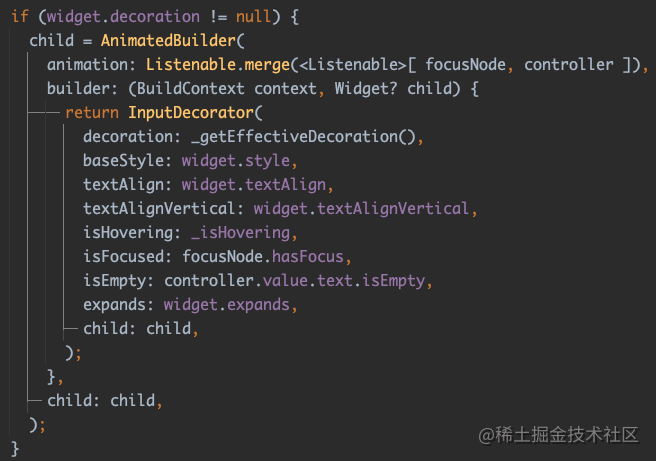 关于 InputDecorator 的内部参数解析这里就不多说,以前在书里已经有详细介绍过,用过 TextField 的大家对于 InputDecorator 应该也不会陌生,在 TextField 里 InputDecorator 的实现是和 AnimatedBuilder 一起组成使用。