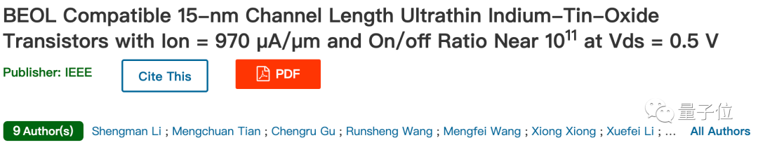 此外,2019年,李晟曼还在微电子器件领域顶会IEDM上作了口头报告,题为《BEOL Compatible 15-nm Channel Length Ultrathin Indium-Tin-Oxide Transistors with Ion = 970 μA/μm and On/off Ratio Near 1011 at Vds = 0.5 V》。