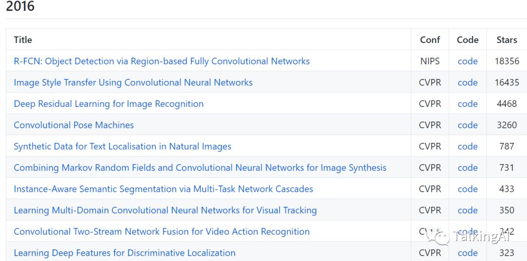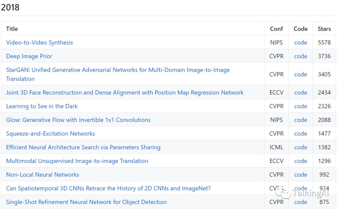 初略估计,目前整理论文数量(均有开源代码)为1535篇(这个数字好庞大,真的都要看吗😔),最高论文的stars高达46593. 不过有点欣慰的是,看到2017和2018的论文list还是很欣慰的,因为都还比较熟悉,比如Deep Image Prior,Non-Local Neural Networks,Single-Shot Refinement Neural Network for Object Detection,Focal Loss for Dense Object Detection, 最经典的Mask R-CNN,Densely Connected Convolutional Networks 等等~ 这些建议如果没有看过的同学们,一定要看哈~