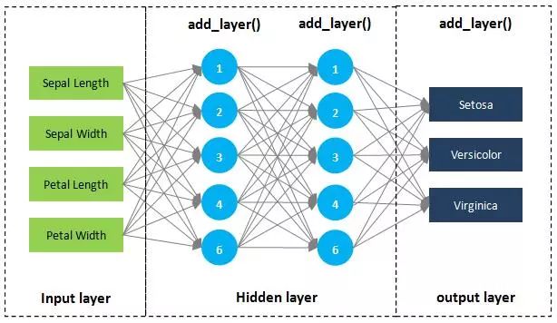 我们仍以 iris 数据集为例,用神经网络来对鸢尾花的品种进行预测。神经网络的基本概念,比如神经元、激活函数等,这里不做介绍。我们对神经网络做如下设计:
