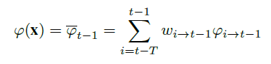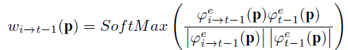 其中softmax相当于把权重归一化一下。这里i取t-1到t-6。此处操作,相当于所有特征和t-1帧特征计算一次cos距离,与t-1帧越相似,则权重越大。显而易见,第t-1帧和第t-1帧肯定是最相似的,因为他们完全一样。